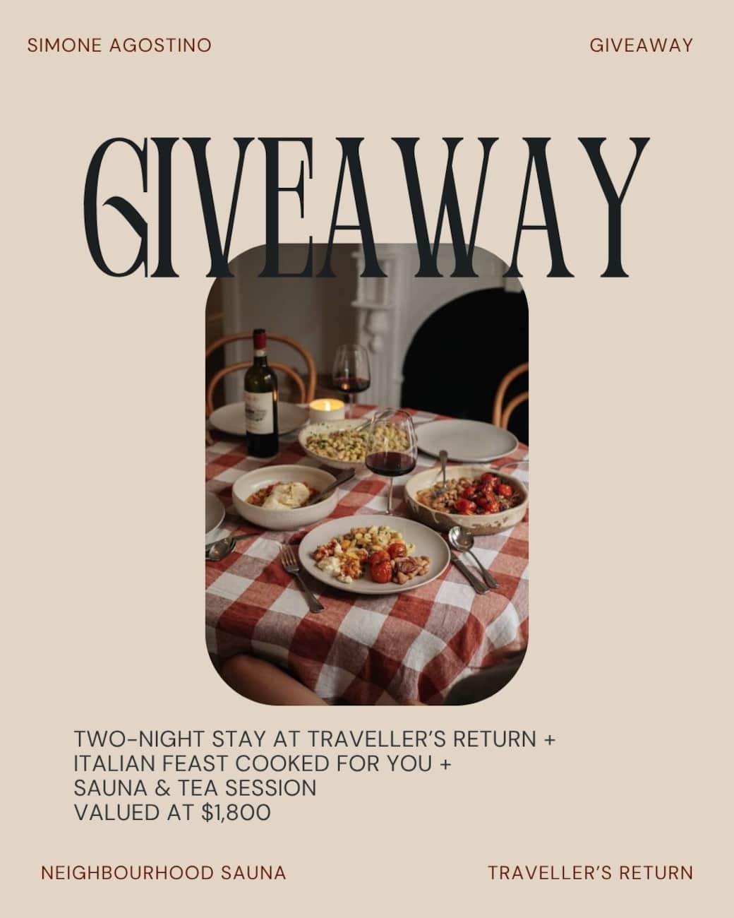 WIN a two-night getaway at Traveller's Return + Simone Agostino Feast Cooked for You + Sauna & Tea Session at Neighbourhood Sauna